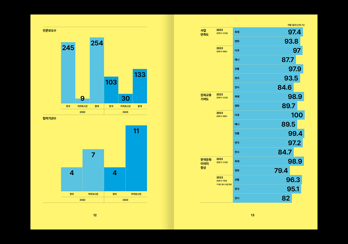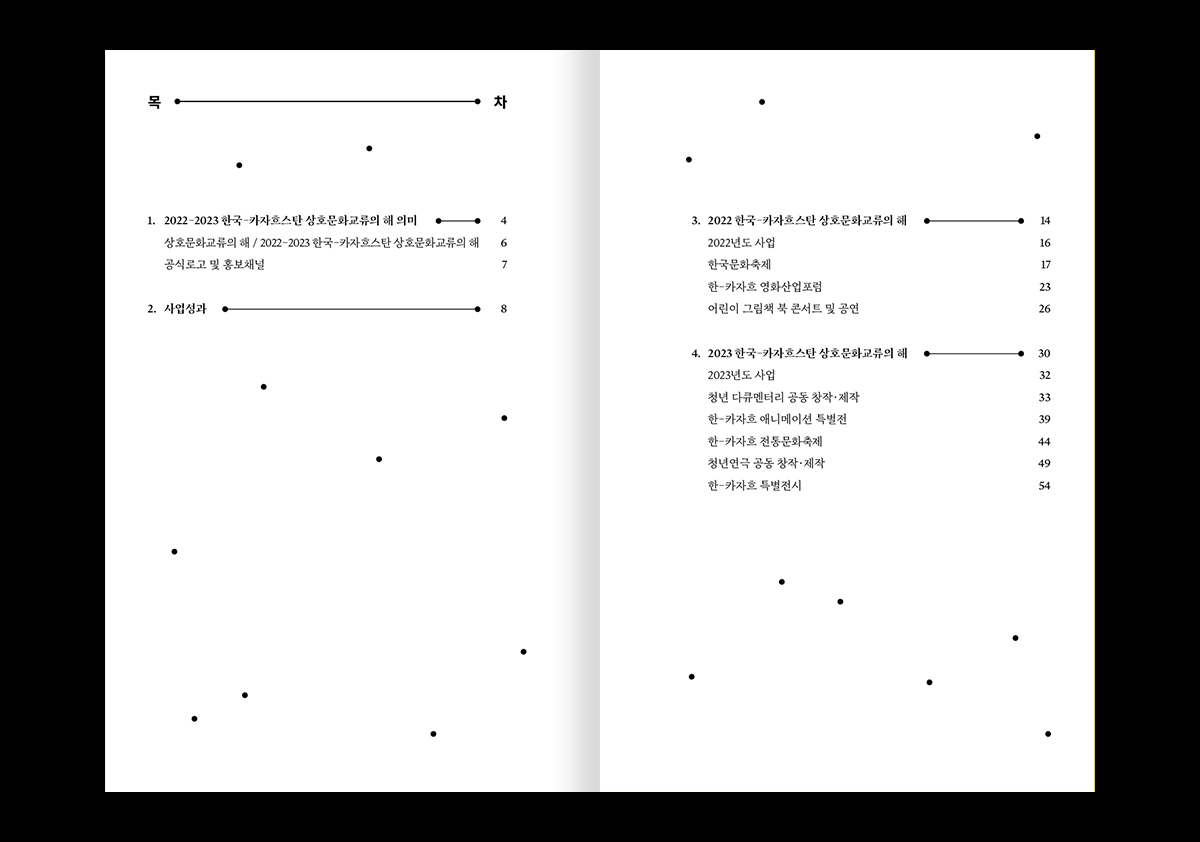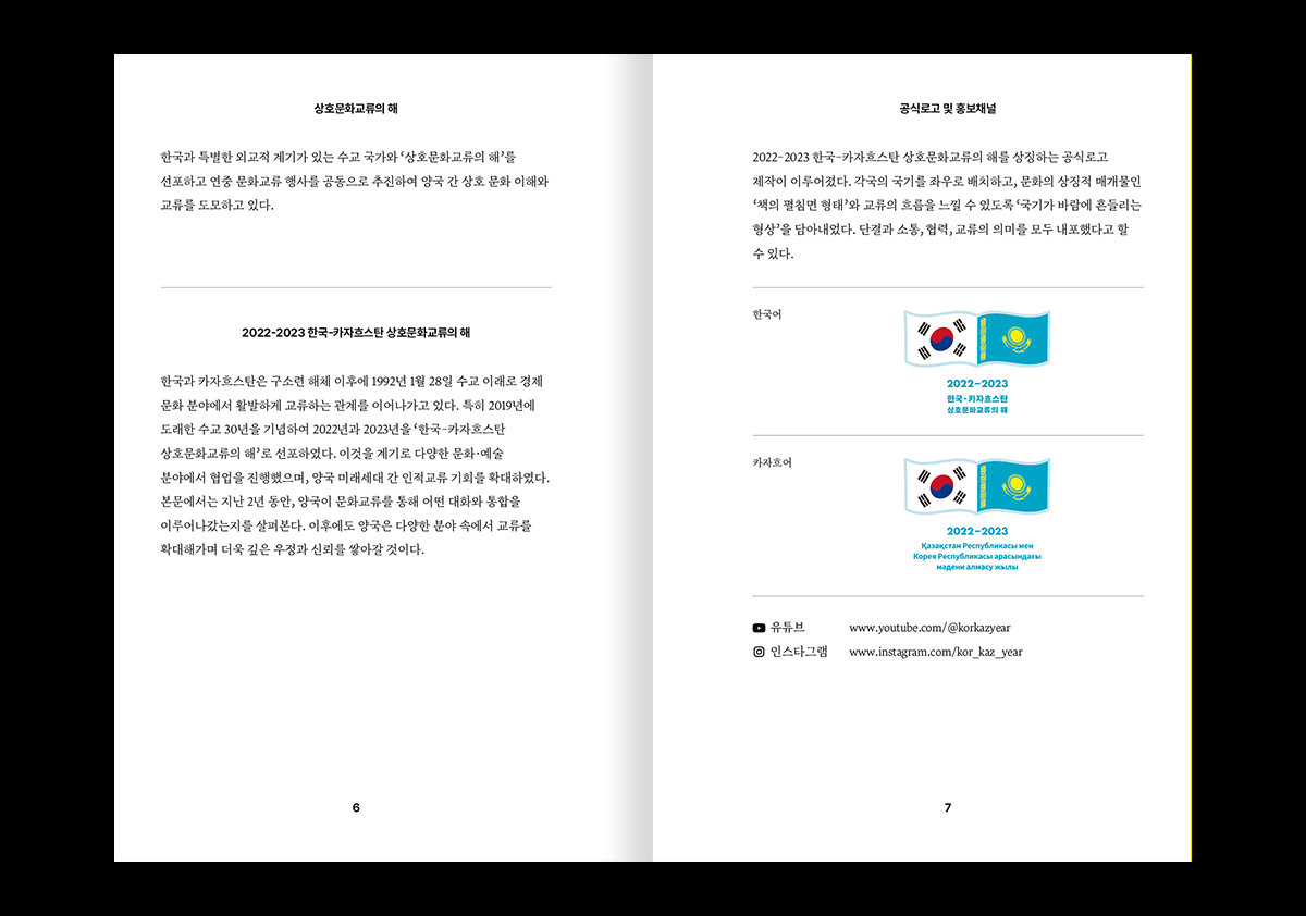 문화체육관광부는 수교국과의 ‘상호문화교류의 해’를 선포하고, 그 2년간의 여정을 기록집에 담았습니다. 저희는 매년 대상국이 바뀌어도 교류의 흐름을 한눈에 파악할 수 있도록 시리즈형 디자인 시스템을 구축하는 데 집중했습니다. 점과 선으로 이뤄진 키비주얼은 양국의 연결을 상징하는 동시에, 국가별 변주가 용이한 시각 체계가 될 것입니다.